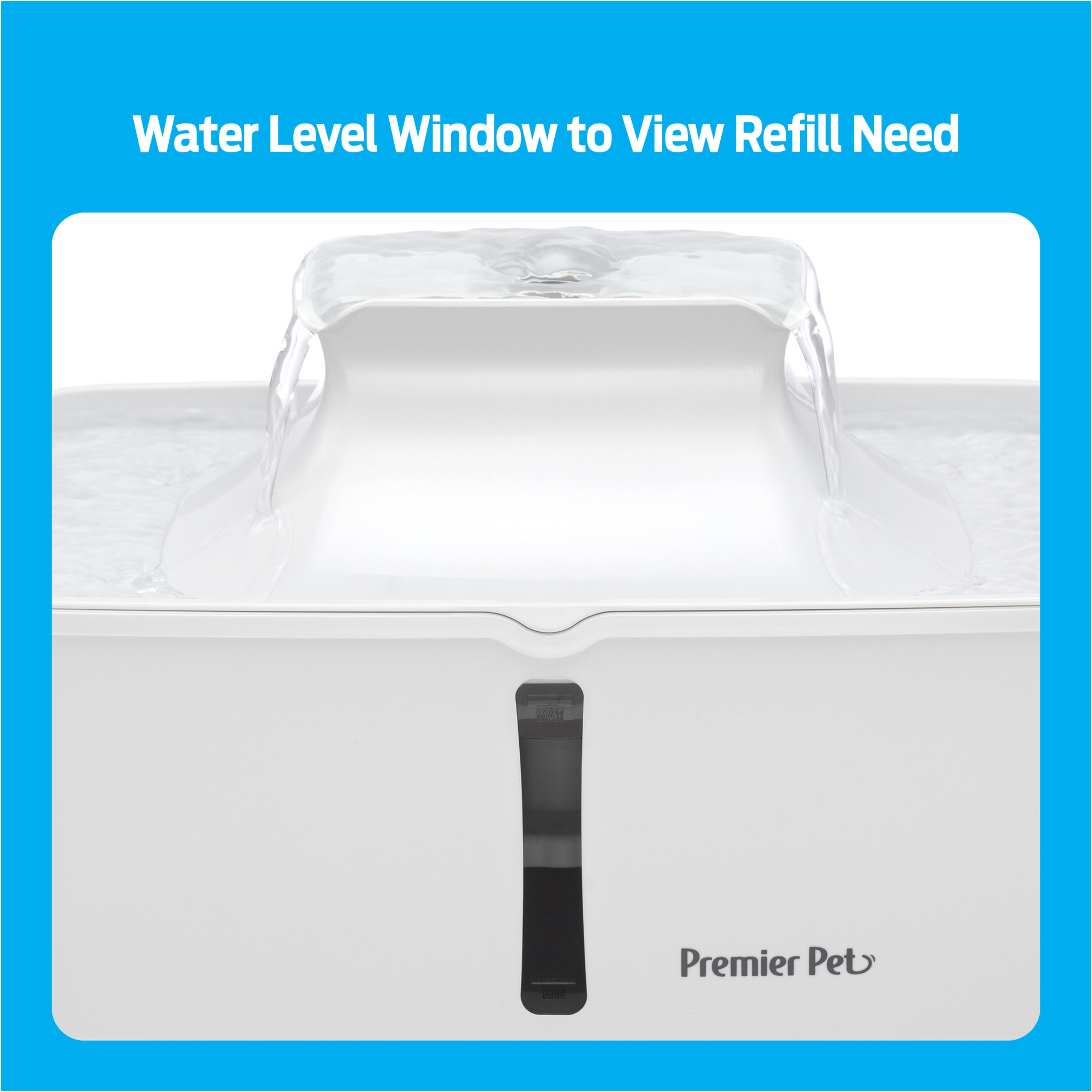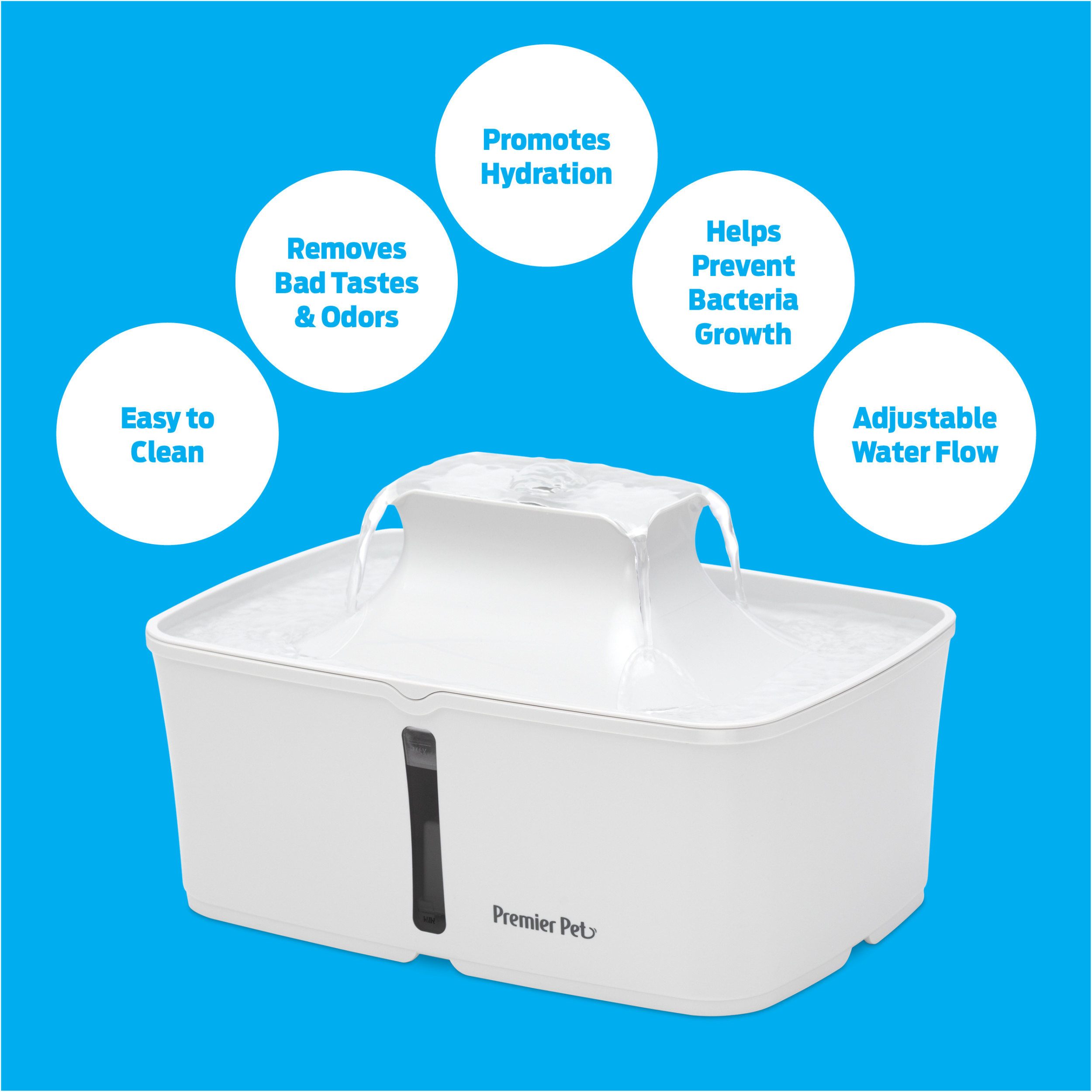 The Premier Pet 128 oz. Fountain provides up to 128 ounces of fresh, filtered water for dogs, cats, & multi-pet homes. 4 free-falling streams encourage pets to drink more, promoting proper hydration to support urinary & kidney health, & a built-in Dual-Filtration System removes dirt, hair, bad tastes & odors. The constant flowing water, which can be adjusted with a flow-control knob, helps to prevent bacteria growth, keeping the fountain cleaner than a standing water bowl. The new sleek, compact design features a water level window to view refill need & offers your pet multiple drinking options: 4 free-falling streams or the lower bowl with still water. This BPA-Free plastic fountain comes apart for easy cleaning & is top-shelf dishwasher safe (excluding pump). Give yourself the happier, healthier pet you deserve by giving them the Premier Pet 128 oz. Pet Fountain!